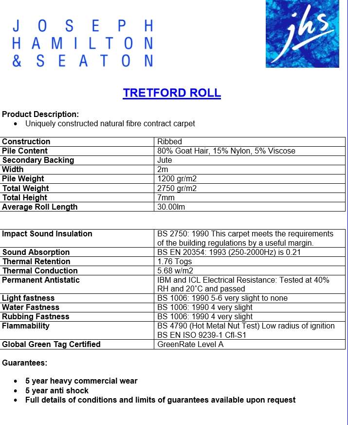 55% OFF - Tretford Cord by JHS is a beautiful and unusual contract carpet made from 80% Cashmere Goat hair,15 % Nylon and 5% Viscose with a heavy duty Jute backing. We have several popular colours available here in a 2m wide roll at a very special offer price. With a total weight of 2,750 grams per square metre this well known contract range has naturally enhanced acoustic and thermal properties, it actually helps reduce airborne dust and allergens by acting as a natural air filter and comes with an impressive 5 Year Manufacturers Warranty.