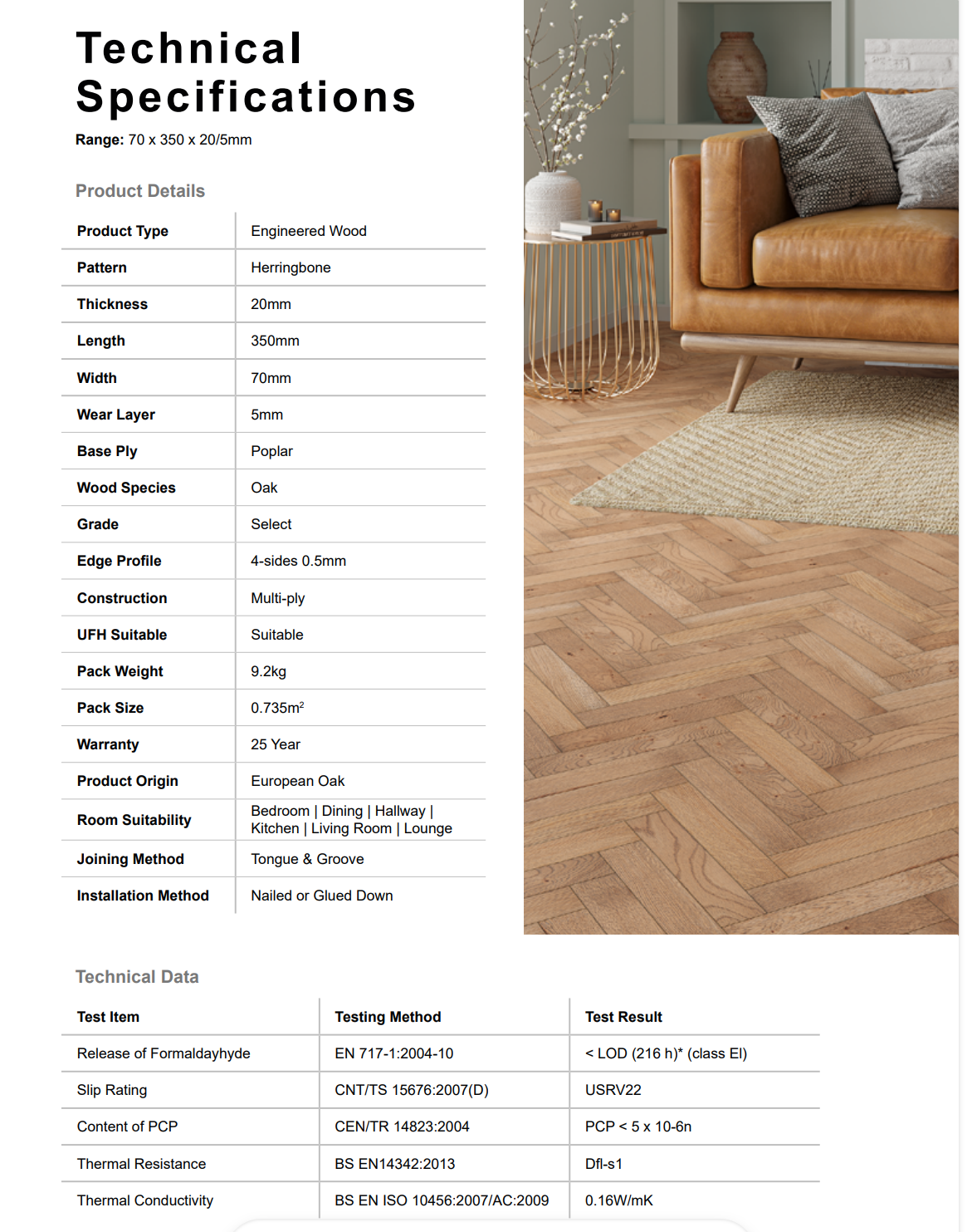Suitable for use with underfloor heating, this flooring offers comfort, efficiency and long-term value. The tongue and groove system ensures a precise fit using a glued or nailed installation method for maximum stability. Ideal for all rooms except bathrooms, including lounges, bedrooms, kitchens and hallways. Backed by a 25 year manufacturer guarantee, this Premium Herringbone 20mm Engineered Wood Flooring offers a refined balance of natural beauty, durability, and long lasting performance.
